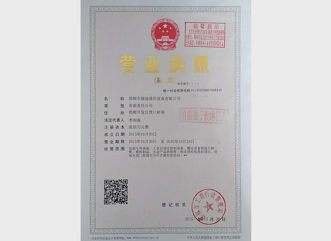 邯鄲市瑞冠智能化裝備有限公司辦公室地址位于具有1萬年的歷史和3100年的建城史的邯鄲,邯鄲 邯鄲開發(fā)區(qū)賈口村南,于2015-10-30 在邯鄲工商局注冊成立,注冊資本為200萬人民幣(萬元),公司已經(jīng)公司發(fā)展壯大的5年,愿與社會各界同仁攜手合作,謀求共同發(fā)展,繼續(xù)為新老客戶提供優(yōu)秀的產(chǎn)品和服務(wù)。我公司主要經(jīng)營包裝專用設(shè)備、工業(yè)自動化控制設(shè)備、搬運(yùn)設(shè)備制造與銷售;塑料制品、五金產(chǎn)品的銷售(依法須經(jīng)批準(zhǔn)的項(xiàng)目,經(jīng)相關(guān)部門批準(zhǔn)后方可開展經(jīng)營活動),我公司與多家邯鄲零售商和代理商建立了長期穩(wěn)定的合作關(guān)系,品種齊全、價(jià)格合理,企業(yè)實(shí)力雄厚,重信用、守合同、保證產(chǎn)品質(zhì)量,以多品種經(jīng)營特色和薄利多銷的原則,…